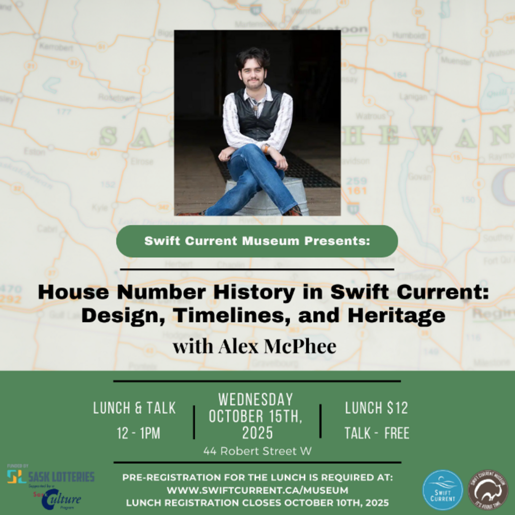 Come by the Swift Current Museum at 12:00pm on Wednesday, October 15th to hear Alex McPhee discuss House Number History in Swift Current! Drop in and learn the fascinating details about design, timelines, and the heritage we can gather from house numbers. Lunch is $12 and the talk is completely free!