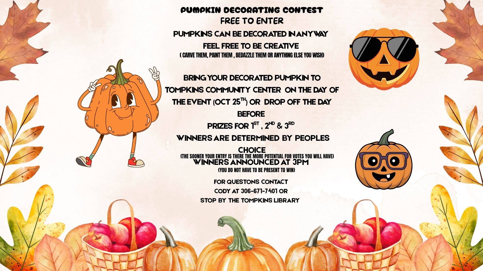 Pumpkin decorating contest ( bring you pumpkin decorated to enter) free to enter prizes for 1st 2nd and 3rd (Peoples choice) see poster for full details