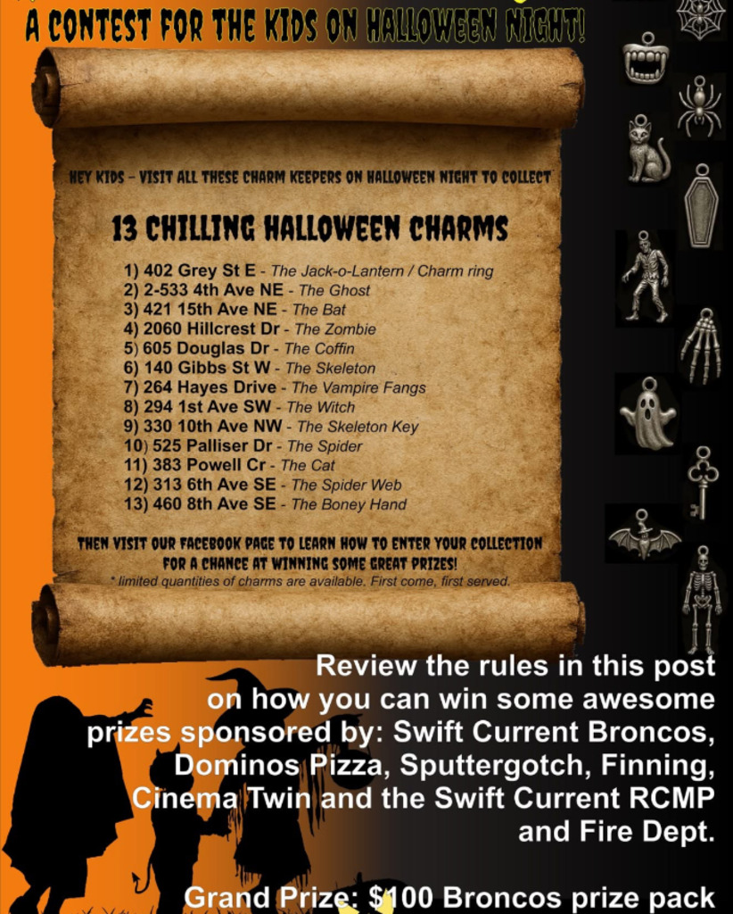 On Halloween night kids are encouraged to visit the 13 Charm Keepers and collect Halloween themed charms from each. There are 13 different charms available between the prime spooky hours of 6p and 9p Halloween night (some charm keepers may start earlier and/or end later). The goal is to collect a complete set (or as many as you are able to collect) of "Chilling Charms" Halloween night and post ONLY ONE photo of your little haunter(s) and their charm collection when called to do so on a SEPARATE POST. All those who have collected a FULL SET of ALL 13 DIFFERENT CHARMS will be entered for the grand prize draw provided by the Swift Current Broncos valued at over $100.00 along with a random loot bag. All others will be entered into the secondary prize draw for a random loot bag. Charms you have collected are yours to keep.