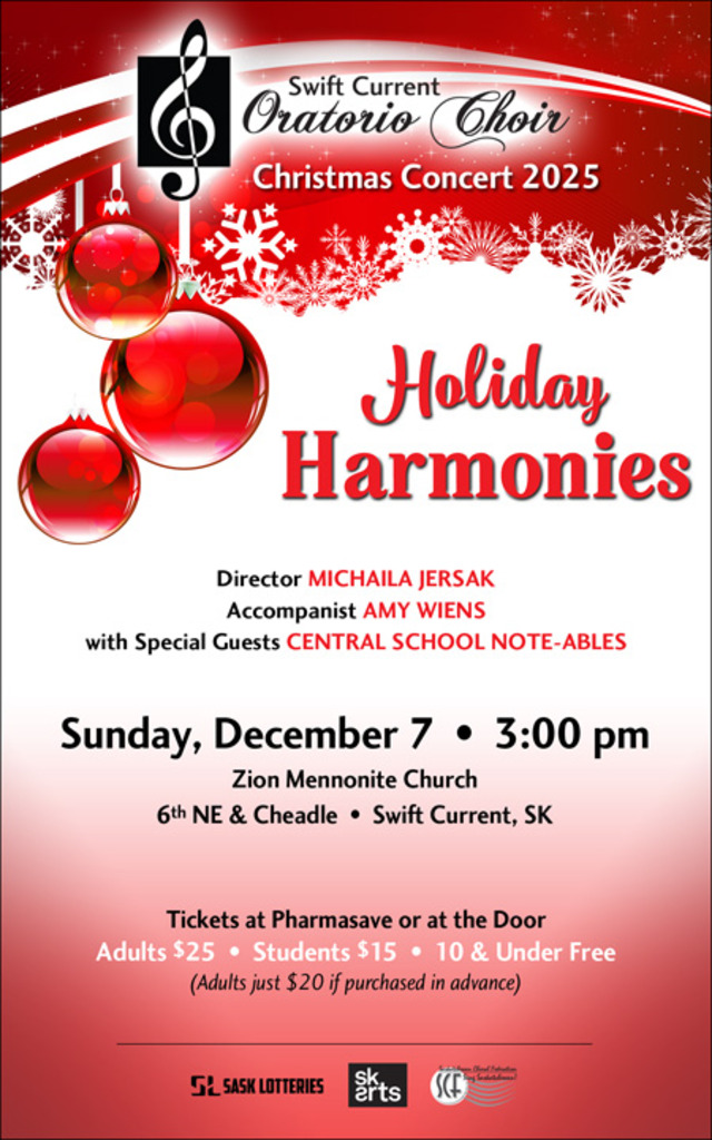 "Holiday Harmonies" for all ages, with special guests the Central School Note-ables Choir, who will perform three numbers. The concert also features arrangements of Christmas classics, plus a Yiddish and Swedish carol, and other pieces with unique harmonies. A great way to get in the holiday mood! Get your tickets at Pharmasave or at the door. Adults just $20 if purchased in advance.