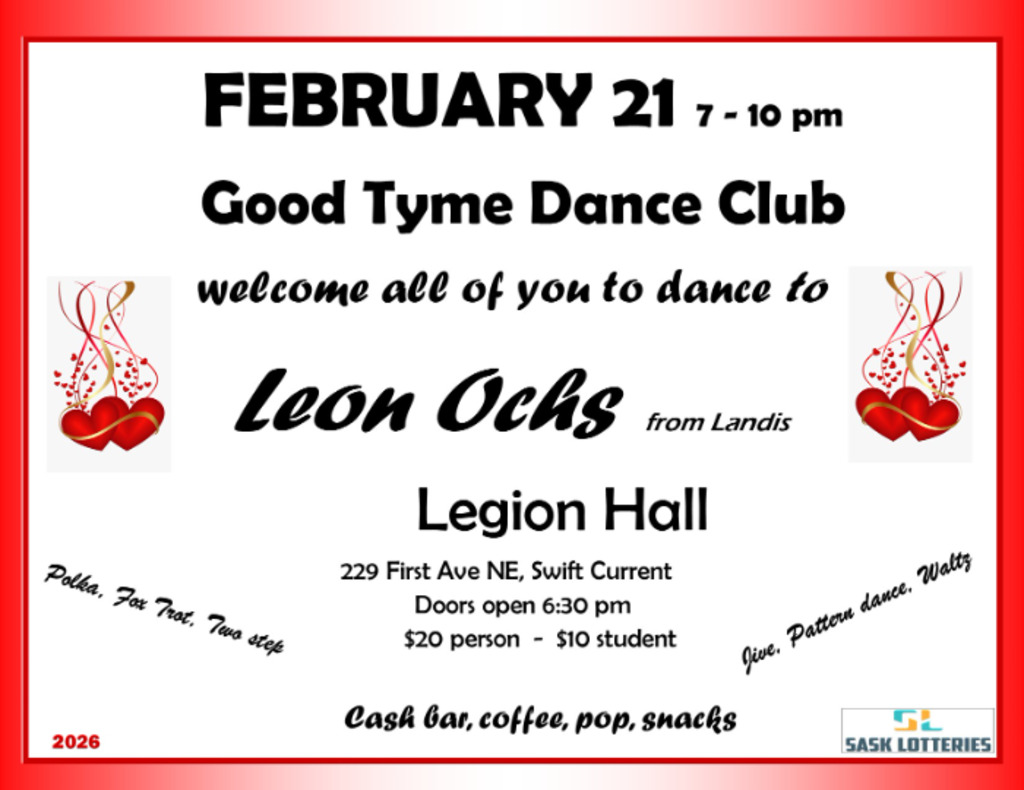 Leon Ochs from Landis is providing the music for the Good Tyme Club's February 21 dance at the Legion Hall, 239 First Ave NE, Swift Current. All are welcome to join us to fox trot, 2 step, polka, jive, etc. from 7 to 10 pm. We are willing to help you learn to dance!! Cash bar, pop, coffee & snacks. $20 per person; $10 per student.