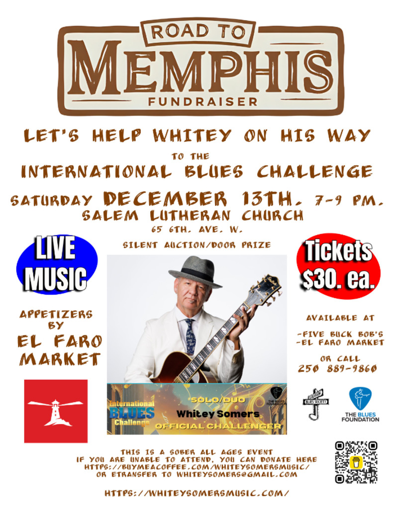 Greetings and salutations. I would like to announce a Community Fundraiser to help Whitey Somers Music with the costs of the journey for the "Road To Memphis" and the International Blues Challenge, representing the Saskatoon Blues Society and all of Saskatchewan. 😎 Sat. Dec. 13th. at The Salem Evangelical Lutheran Church 65 6th. Ave. W. Shaunavon, 7-9pm. Memphis themed treats by El Faro Market, Live Music, Door Prize, Silent Auction and more. Tickets are available at Fivebuckbobs, Leona's Baked Goods, Whitey's Strings & Other Musical Things and El Faro Market.😊✌️💖🎶 If you are unable to attend and still would like to help, you can donate here: https://buymeacoffee.com/whiteysomersmusic
