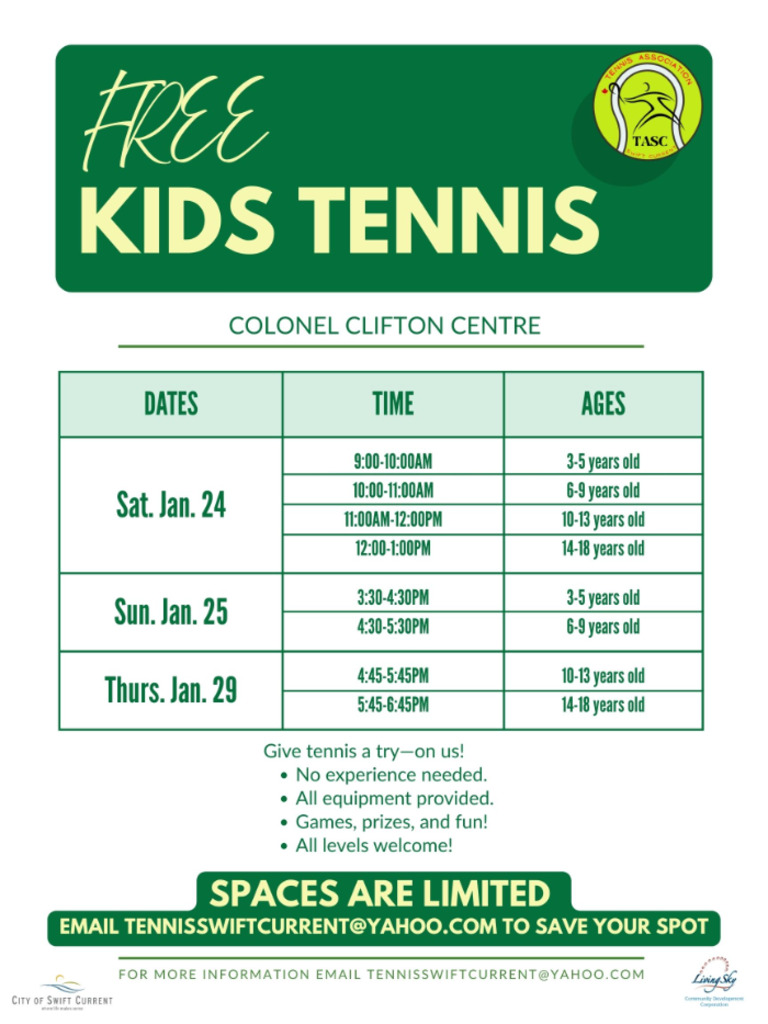 We are hosting Free Kids Tennis Clinics in January and you're invited! Email tennisswiftcurrent@yahoo.com to save your spot.