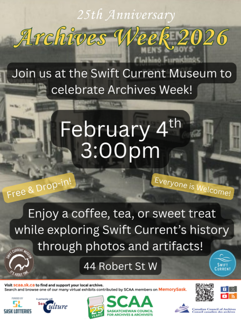 Drop in to the Swift Current Museum on Wednesday, February 4th at 3:00pm to celebrate and enjoy a warm drink and tasty treats. We will have plenty of photographs to peruse, as well as artifacts on display. No-registration required. Everyone is welcome and we look forward to seeing you!