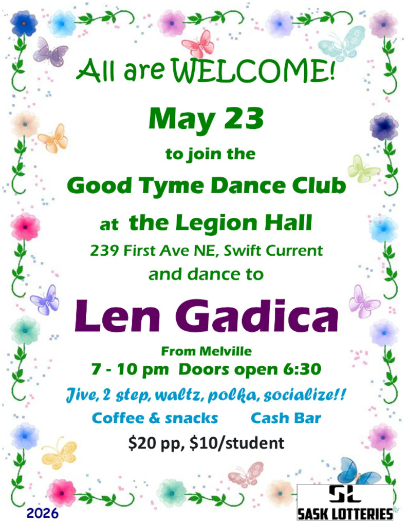 Len Gadica from Melville is providing the music for the Good Tyme Club's dance May 23 7 - 10 pm at the Legion Hall, 239 First Ave NE, Swift Current. Doors open at 6:30 pm All are welcome to dance or learn a variety of steps - jive, fox trot, 7 step, waltz, heel toe polka, etc. $20/person, $10/student. Cash bar, coffee & snacks.