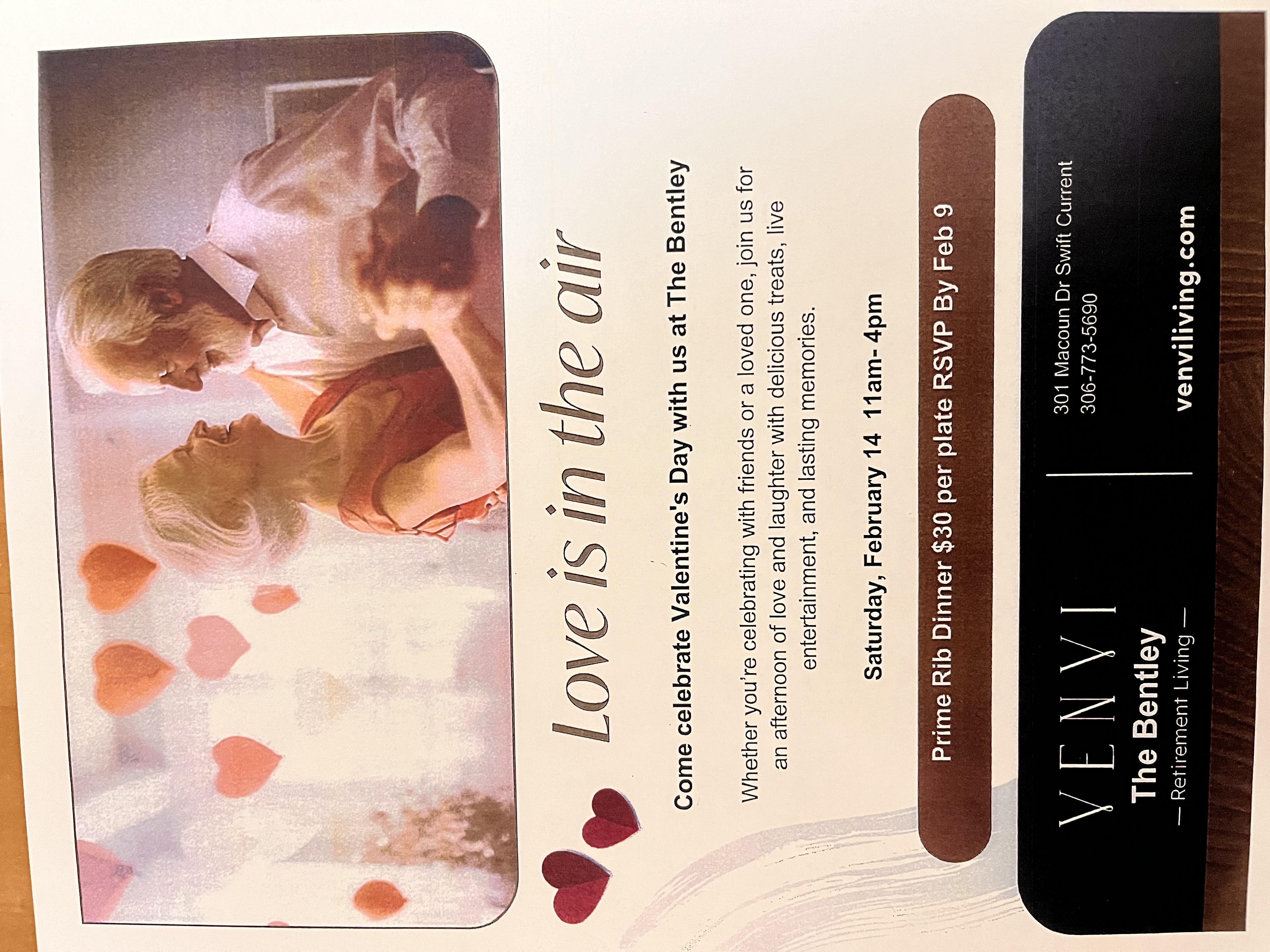 Prime rib dinner by rsvp only. Afternoon entertainment and activities. Feb 14, 11 to 4 pm