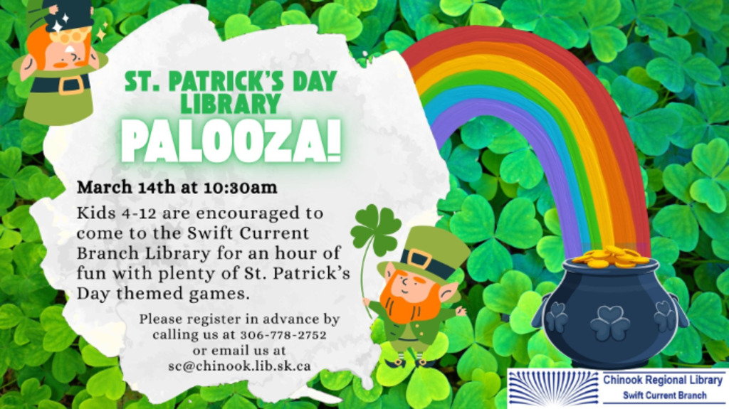 Kids aged 4-12 years old are encouraged to come to the Swift Current Branch Library for an hour of fun with plenty of St. Patrick’s Day themed games.