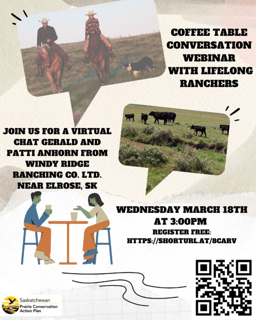 Gerald and Patti Anhorn from Windy Ridge Ranching Co. Ltd. near Elrose, SK will speak about grass and water management. They were honoured as winners of the provincial Environmental Stewardship Award in 2022. Join us for a conversation about why ranchers ranch, their favourite part of their job and the wildlife that they see everyday. They will talk about how they use rotational grazing to increase biodiversity as well as productivity on their farm.