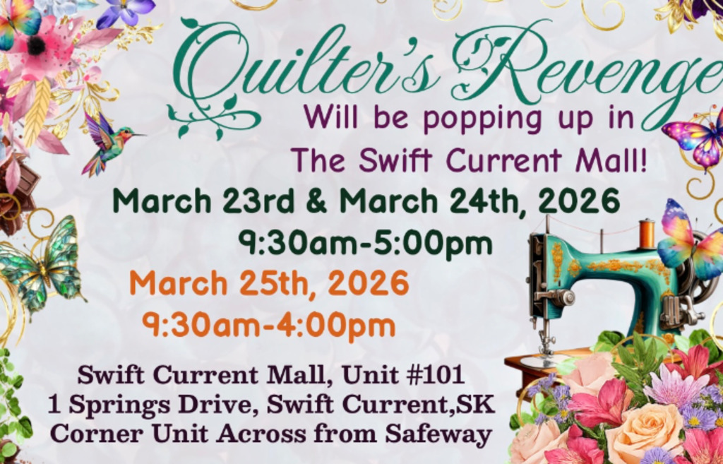 Quilter’s Revenge will be popping up in the Swift Current Mall with gorgeous fabrics and threads for your beautiful creations!